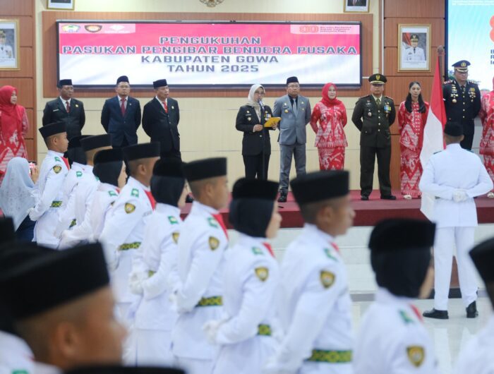 LENSA, GOWA – Bupati Gowa, Sitti Husniah Talenrang mengukuhkan 70 Anggota Pasukan Pengibar Bendera Pusaka (Paskibraka) Tingkat Kabupaten Gowa Tahun 2025 di Baruga Karaeng Galesong, Kantor Bupati Gowa, Jumat (15/8) malam.