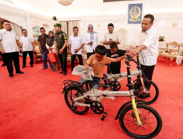 Dengan wajah polos dan pakaian sederhana, keduanya disambut hangat. Momen penuh haru itu semakin berkesan ketika Gubernur menyerahkan hadiah berupa sepeda untuk masing-masing anak.