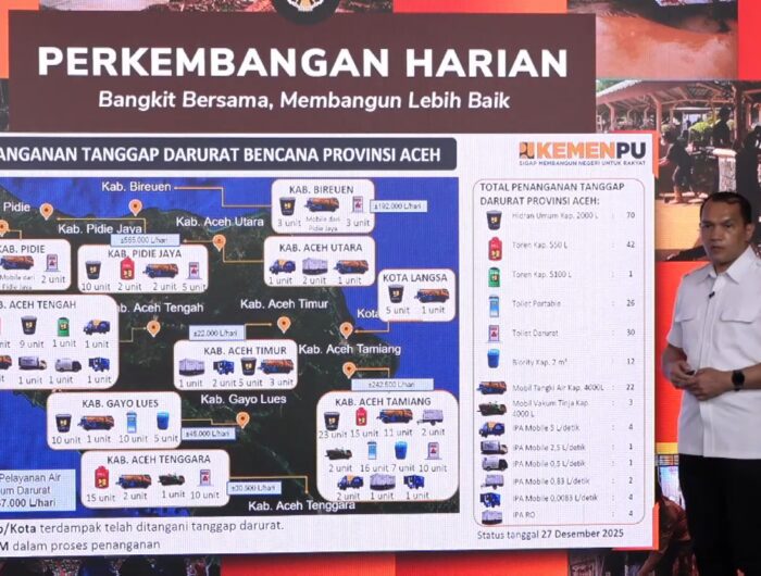 “Sarana air minum itu tersebar di 22 kabupaten/kota di daerah terdampak,” kata Direktur Air Minum, Direktorat Jenderal Cipta Kerja Kementerian Pekerjaan Umum, Oscar Siagian, dalam konferensi pers update penanganan bencana Sumatera, Minggu (28/12).