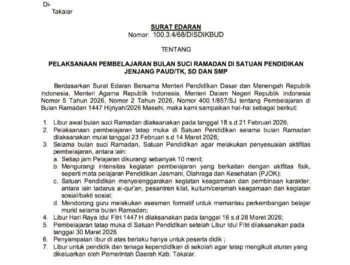 Kebijakan ini secara resmi dikeluarkan oleh Dinas Pendidikan dan Kebudayaan Takalarb (Disdikbud) melalui Surat Edaran Nomor: 400.1/857/SJ/Disdikbud/II/2026 dalam rangka menyambut bulan suci Ramadan 1447 Hijriah. Surat tersebut ditandatangani Kamis (14/2/2026).