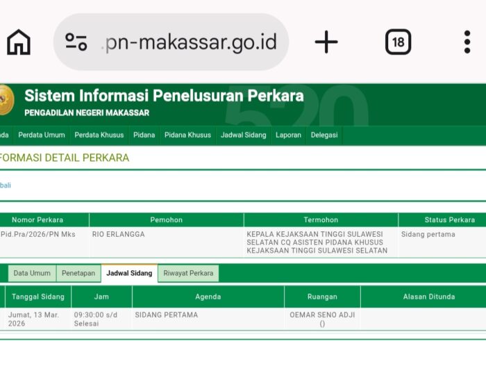 Untuk jadwal sidangnya sendiri tertulis akan digelar pada Jumat besok, 13 Maret 2026, pukul 09.30 Wita di ruang sidang Oemar Seno Adji PN Makassar, Jalan R.A Kartini No.18/23, Kecamatan Ujung Pandang.
