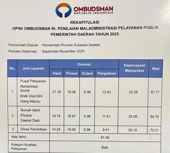 “Pelayanan publik di lingkup Pemprov Sulsel tahun 2025 mendapatkan Opini Kualitas Tinggi dari Ombudsman Republik Indonesia. Hasil ini merupakan baseline untuk opini selanjutnya, karena secara kuantitatif masih terdapat rentang yang cukup jauh menuju opini kualitas tertinggi,” kata Ismu, Rabu (1/4/2026).